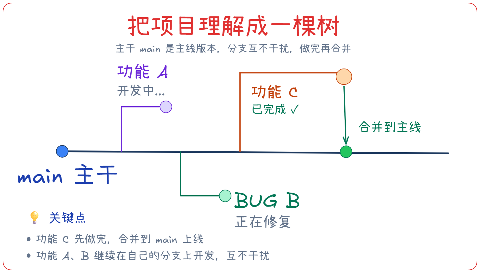 这样 C 功能做完可以直接合并上线,A 和 B 继续在各自分支开发,完全不受影响。