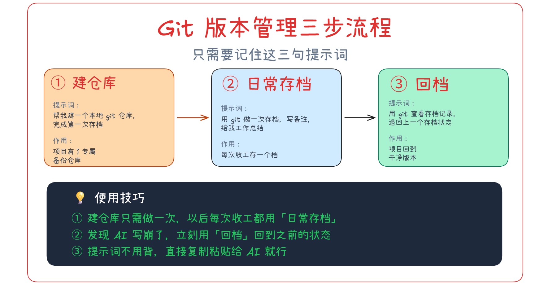 不用担心,全程不需要你记命令,只需要记住几句提示词,就能让 AI 帮你做版本管理。