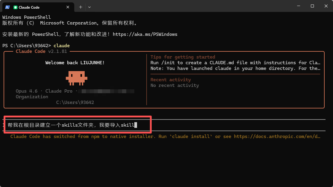 Claude Code 安装 Skill 的方式非常直接,不需要图形界面,直接通过对话完成。