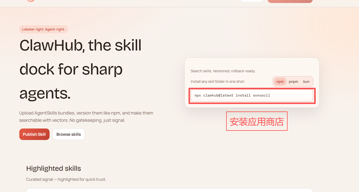 skills 文件夹OpenClaw(龙虾)通过命令行安装 Skill,需要先安装应用市场工具。