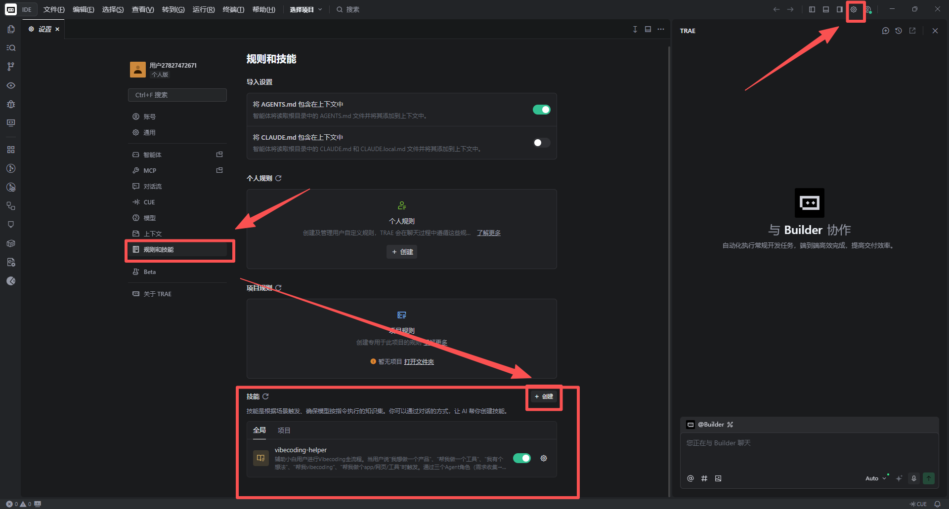 Trae 是国产的 AI IDE 工具,支持图形界面安装 Skill,全程点鼠标即可完成。