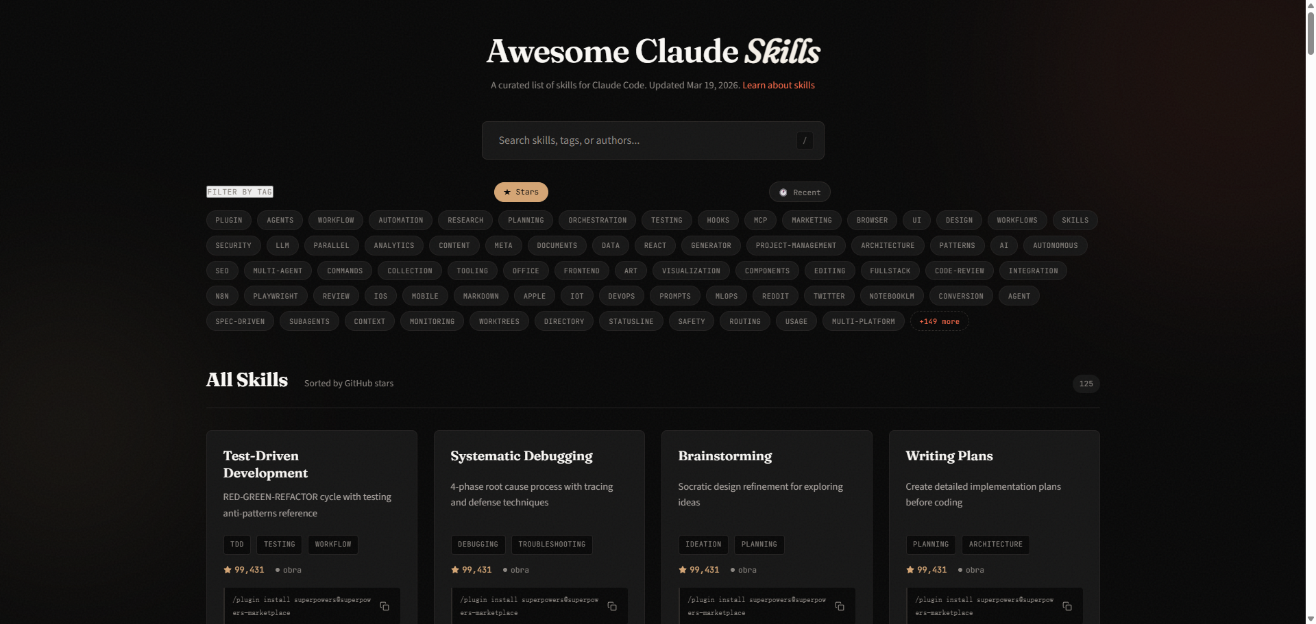 这是开发者社区维护的精选列表,收录了 500+ 社区贡献的 Skill,持续更新中。如果前两个地方没找到想要的,可以来这里搜索。