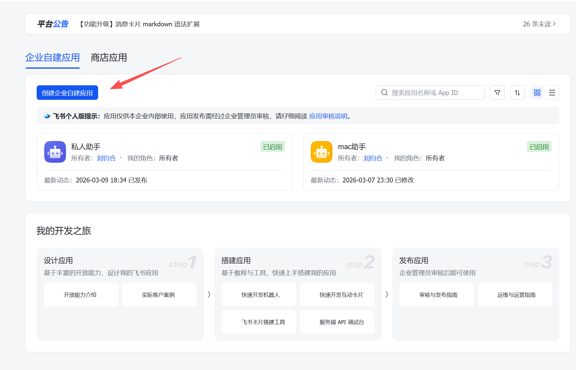 在飞书那边注册一个机器人身份,获取 App ID 和 App Secret,OpenClaw 拿着这组凭证就能以机器人身份收发消息。连接使用 WebSocket 长连接,不需要公网服务器、域名或 ngrok。