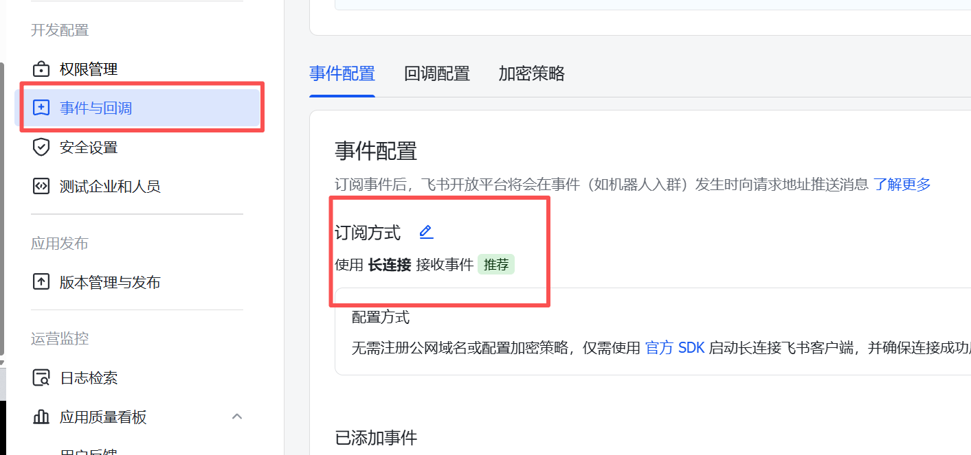 im,将列出的事件全部勾选将飞书的凭证告诉 OpenClaw,建立连接,完成配对后就能在飞书里和 AI 对话了。
